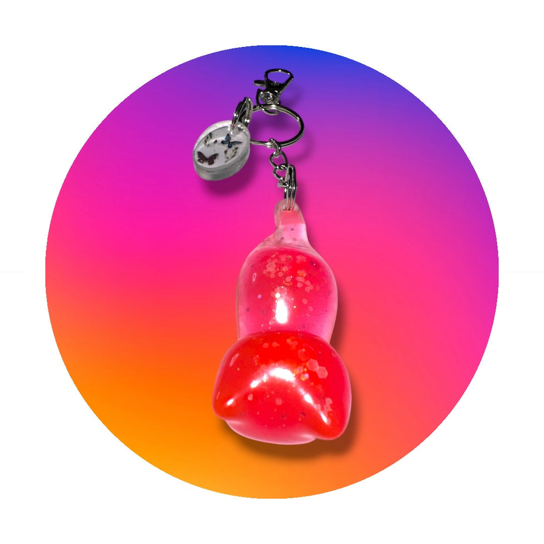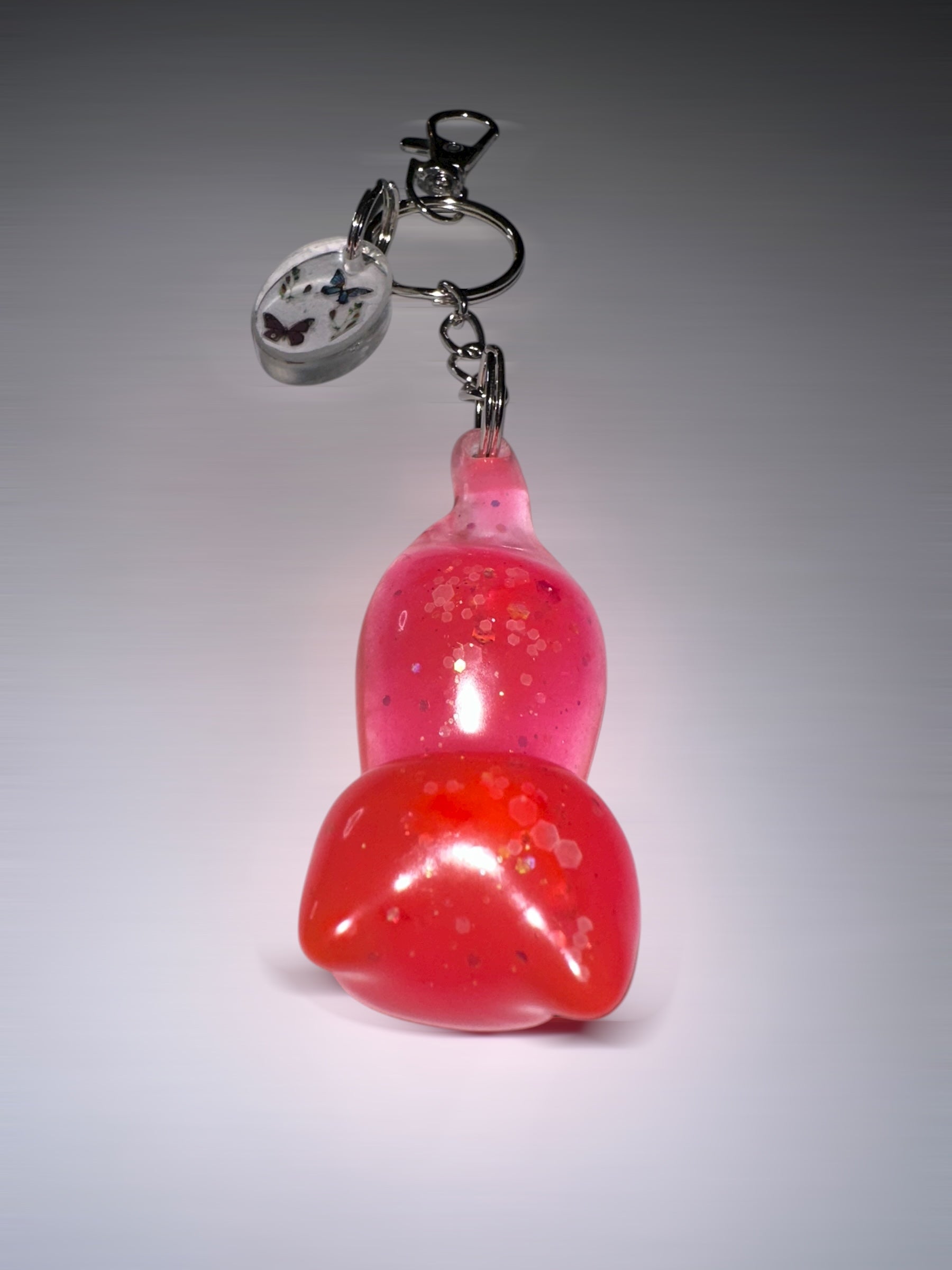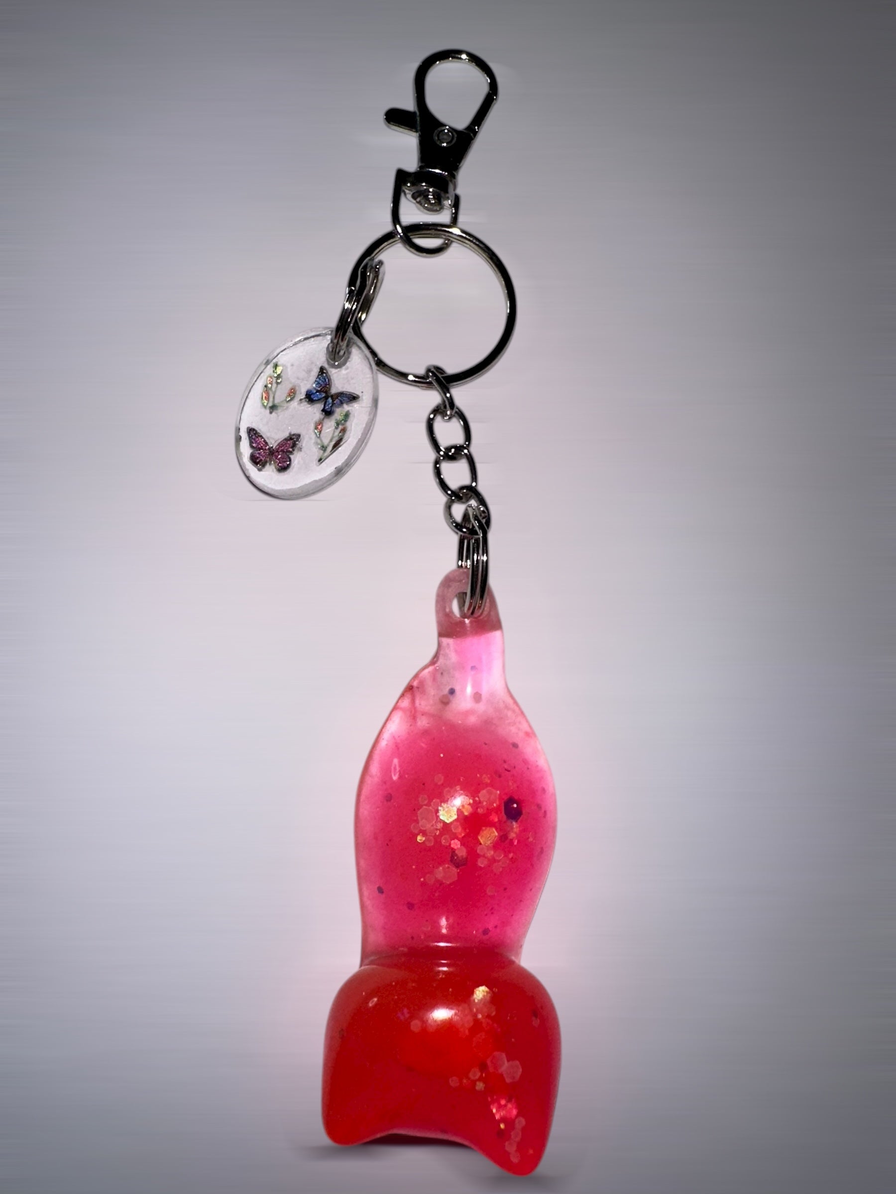 Handmade Cat keychain and charm . Made with epoxy Resin, Glow-in-the-dark Pigment powder, And butterfly stickers