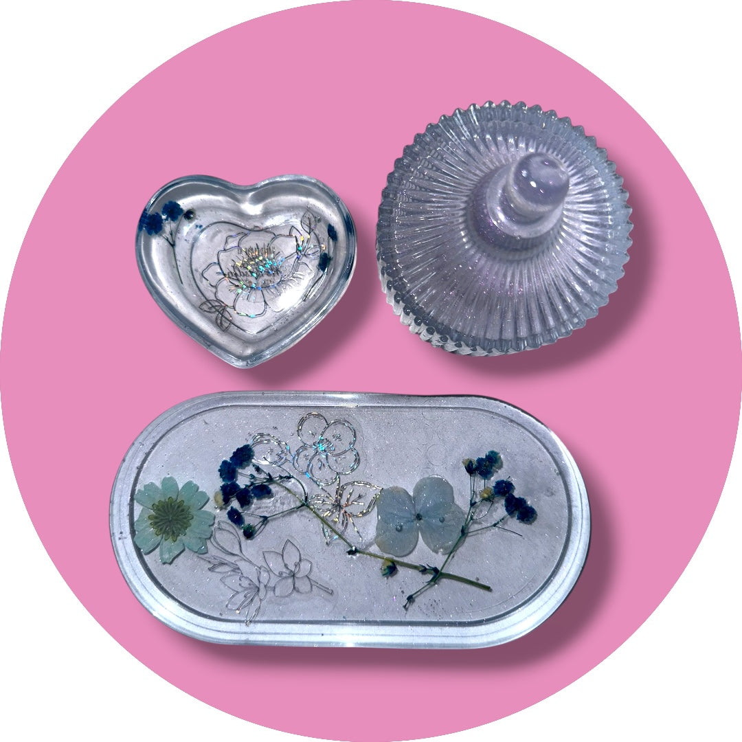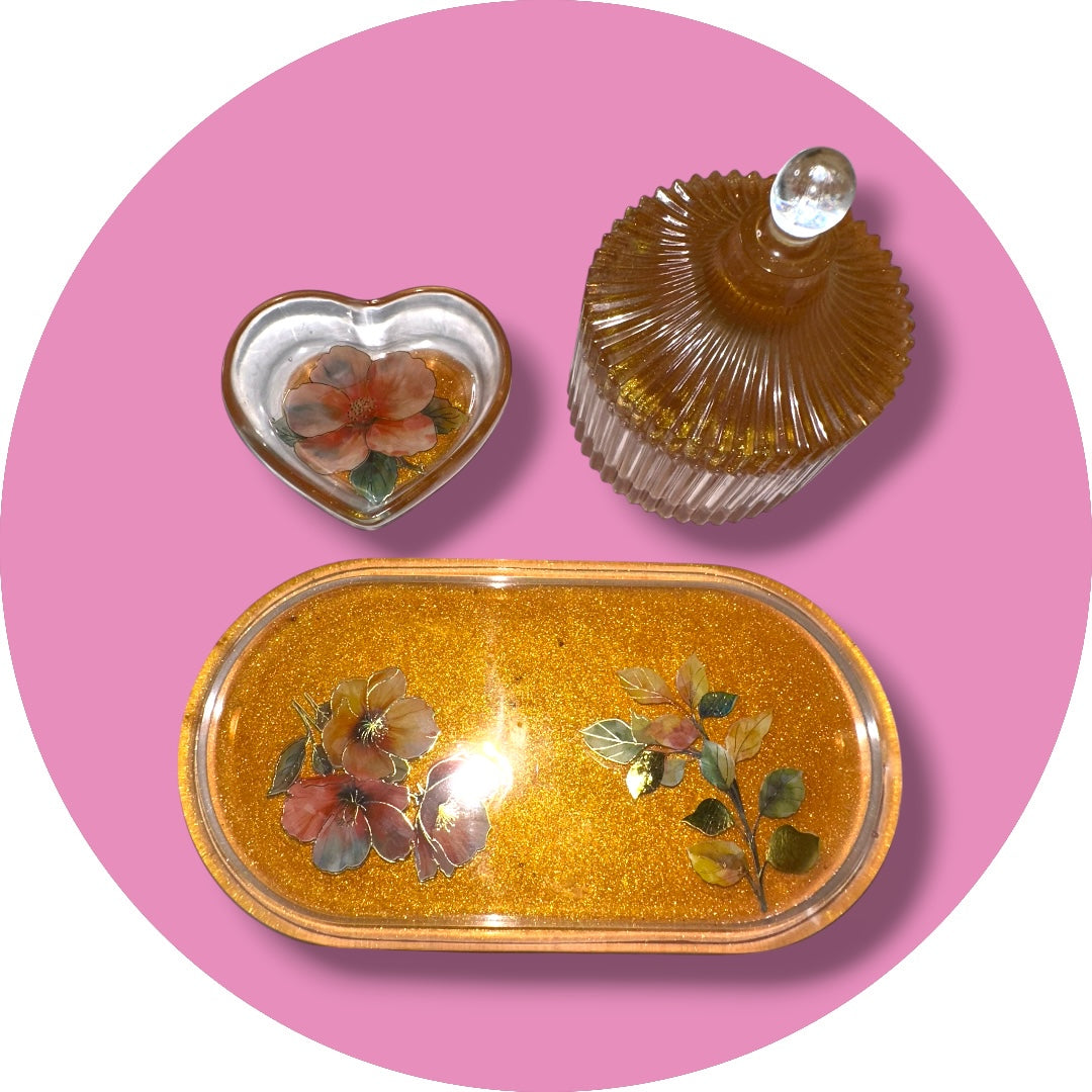 Expertly crafted with real dried flowers, this three-piece jewelry tray set adds a touch of natural beauty to your storage solution. Each tray is uniquely designed and handcrafted, making it a one-of-a-kind piece. Keep your jewelry organized and beautifully displayed with this elegant set.